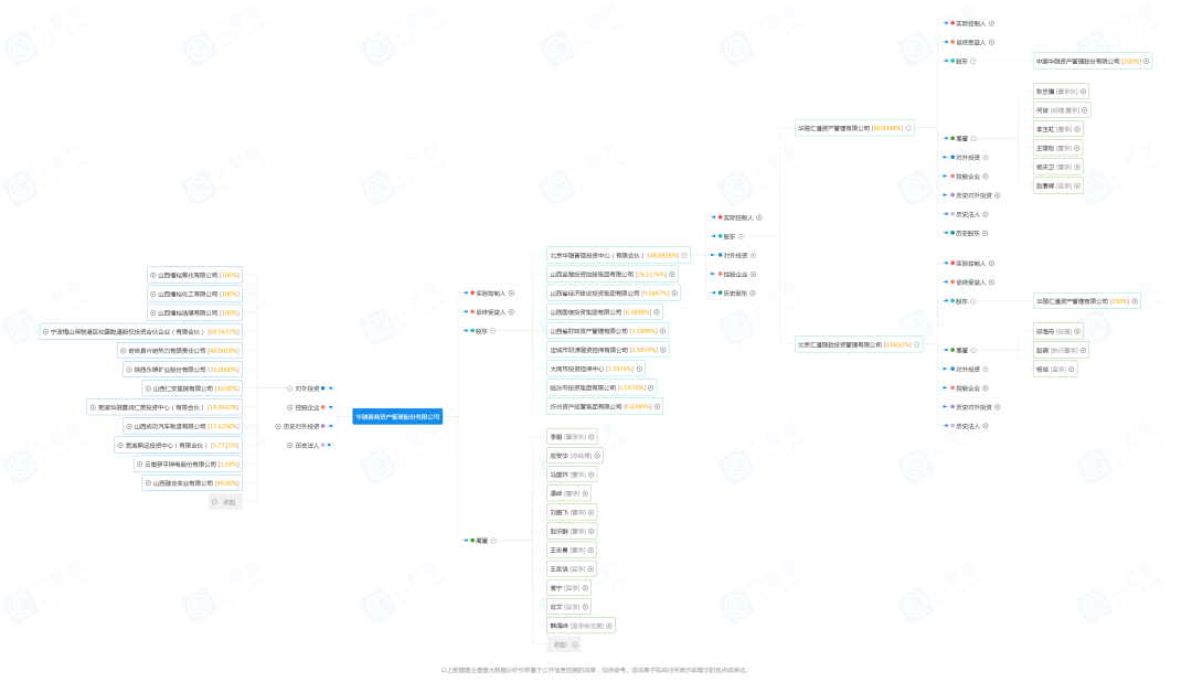 股权穿透信息显示,华融晋商的第一大股东北京华融晋商投资中心(有限合伙,简称:北京融晋)持股48.88%。华融汇通资产管理有限公司(简称:华融汇通)直接持有北京融晋99.9348%的股份,并通过全资子公司北京汇通融致投资管理有限公司(简称:汇通融致)间接持有另外0.0652%的股份。华融汇通则是中国华融资产管理股份有限公司(简称:中国华融)旗下全资子公司。