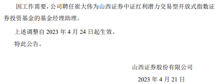 今日,山西证券股份有限公司发布关于聘任基金经理助理的公告,聘任崔大伟为山西证券中证红利潜力交易型开放式指数证券投资基金的基金经理助理。