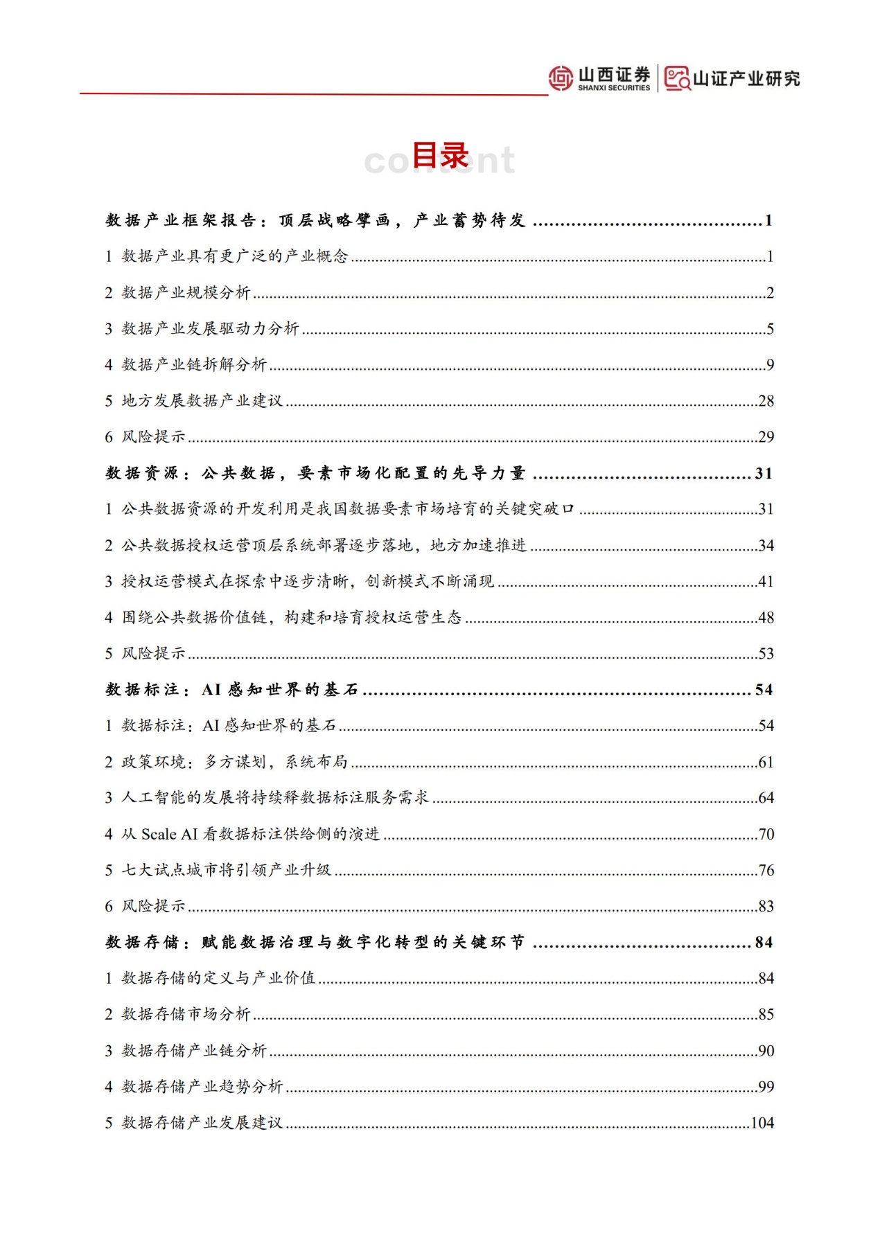 基于上述考量, 山西证券 研究所产业研究团队在聚焦数据和算力两大新型生产要素的基础上,进一步聚焦研究重点,以数据产业全链条研究为核心,形成了2025年度《数字经济研究报告合集》。本年度报告合集构建了“总-分-特”完整框架:以数据产业框架性报告为总领,产业链细分报告聚焦数据资源、基础设施、数据标注、数据存储、数据应用核心环节,既全面呈现全国数据产业发展现状、趋势机遇,也融入了对山西数据产业发展的针对性思考,以期对区域产业布局提供参考。