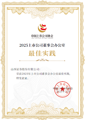 近日, 中国上市公司协会 发布“2025年度上市公司董事会最佳实践案例”评选结果, 山西证券 申报的《守正创新规范高效扎实推进董事会高质量建设》案例成功入选,并荣获“2025年度上市公司董事会优秀实践案例”。