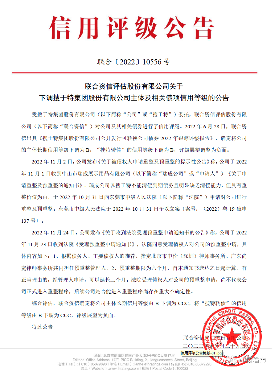 11月29日,联合资信公告称,将搜于特(002503.SZ)主体长期信用等级由B下调为CCC,并将“搜特转债”的信用等级由B下调为CCC,评级展望为负面。