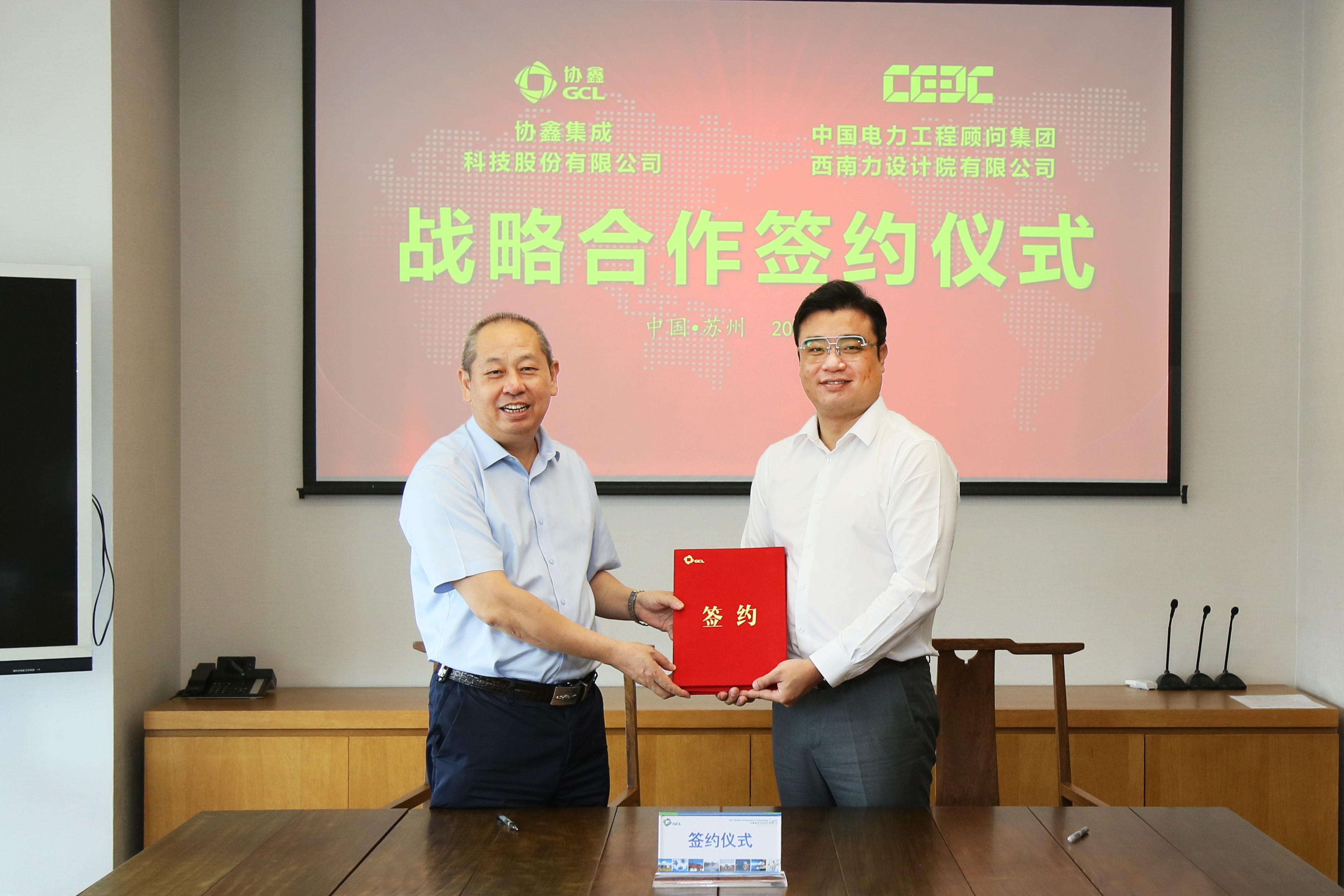 8月3日,协鑫集成科技股份有限公司(下称协鑫集成)与中国电力工程顾问集团西南电力设计院有限公司(下称中国能建西南院)在苏州协鑫能源中心签署战略合作协议,协鑫集成总裁张坤、中国能建西南院新能源工程公司总经理胡伯云出席签约仪式。协议约定自2021年9月份至2022年12月30日,中国能建西南院采购协鑫集成不少于1GW高效组件。