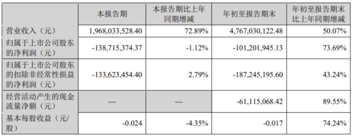 今年第三季度,公司营业收入19.68亿元,同比增长72.89%;归属于上市公司股东的净利润-1.39亿元,同比减少-1.12%;归属于上市公司股东的扣除非经常性损益的净利润-1.34亿元,同比增长2.79%。