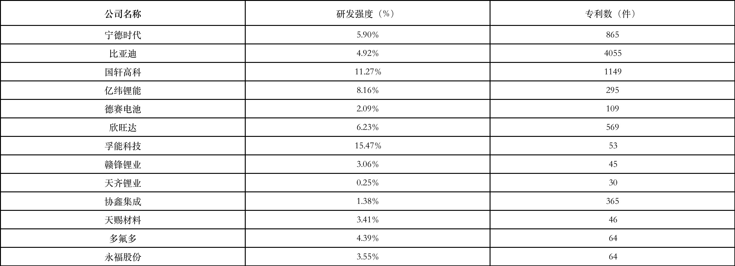 表1 2021年“电池产业链”领域企业研发强度和专利数