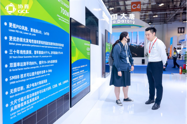 协鑫集成不断引领技术创新,实现TOPCon技术升级,推动光伏行业发展,本次在亚太电协展会上展出的两款N型高效双面单晶组件:NT12-66GDF、NT10/54BH,就是协鑫集成推出的高效低碳产品,组件最高功率达700W,广泛应用于大型地面以及分布式电站。同时还针对工商业建筑屋面场景开发出BIPV组件产品-鑫福顶等一系列产品,为绿色低碳建筑增添动力;再如研发可浸泡、高可靠海面漂浮组件,助力推进全球首个深远海“风光同场”一体化项目,助力海上光伏电站建设等。