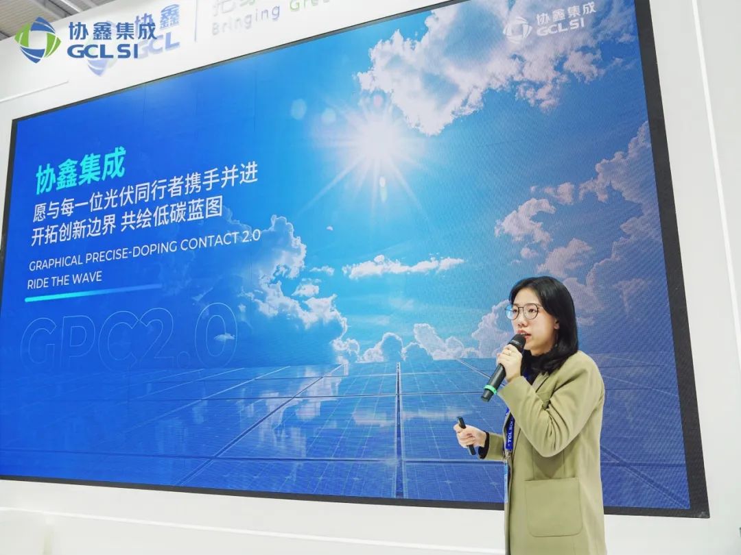 展会首日,协鑫集成产品总监盛夏在展会现场带来了一场题为《分布式场景的超配密码-解锁GPC2.0背后的技术》的精彩演讲,盛夏表示,随着全球分布式光伏市场规模的持续增长,客户对光伏项目的需求日益多元化,不仅关注系统造价,更希望光伏项目能兼具美观外观、更大装机容量和多功能性。针对这一市场需求,协鑫集成不断创新,凭借对“高收益、强适配、稳定运行”核心需求的深刻理解,通过容量、收益与可靠性的三维超配协同创新,实现了新的技术飞跃。在此基础上,协鑫集成推出了基于BC技术的GPC2.0高效组件。