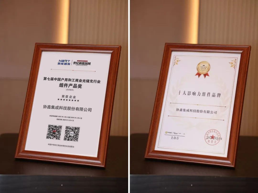 在展会同期,备受瞩目的第八届中国分布式光伏大会和第七届中国户用、工商业光储行业大会隆重启幕,作为国内分布式光伏与工商业储能领域的权威盛会,协鑫集成凭借顶尖的行业创新力、优异的市场表现斩获“十大影响力组件品牌”和“中国户用和工商业光储充行业组件产品”两项大奖。