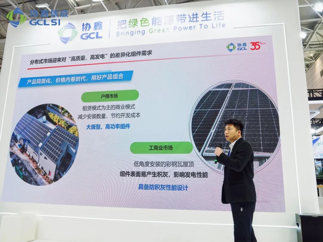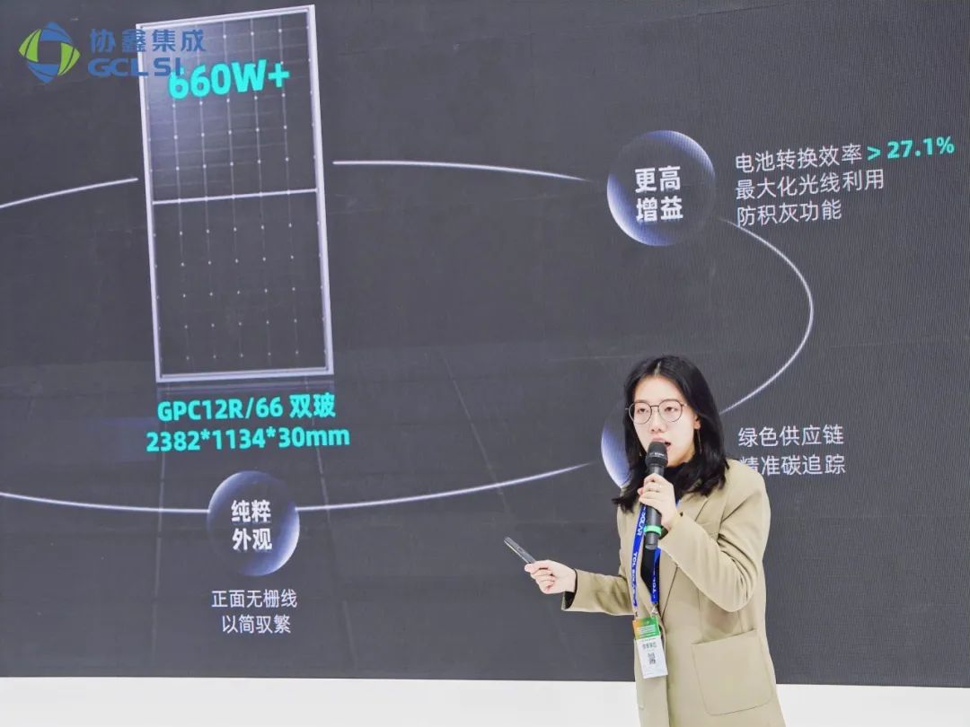 在展会分享环节,协鑫集成产品总监盛夏带来了一场题为《分布式场景的超配密码-解锁GPC2.0背后的技术》的精彩演讲,盛夏表示,随着全球分布式光伏市场规模的持续增长,客户对光伏项目的需求日益多元化,不仅关注系统造价,更希望光伏项目能兼具美观外观、更大装机容量和多功能性。针对这一市场需求,协鑫集成不断创新,凭借对“高收益、强适配、稳定运行”核心需求的深刻理解,通过容量、收益与可靠性的三维超配协同创新,实现了新的技术飞跃。在此基础上,协鑫集成推出了基于BC技术的GPC2.0高效组件。截止2025年2月,协鑫集成GPC2.0电池效率突破27.5%,较去年12月产品发布提升0.4个百分点,为分布式光伏市场带来更加优质的产品和服务。