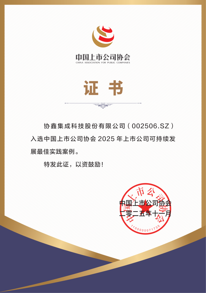 11月18号,由 中国上市公司协会 主办,中上协可持续发展(ESG)专业委员会承办的2025上市公司可持续发展大会在北京召开。 协鑫集成 凭借“NEXT预见”可持续治理战略成功入选“最佳实践案例”,彰显了公司在上市公司可持续发展领域的引领地位。