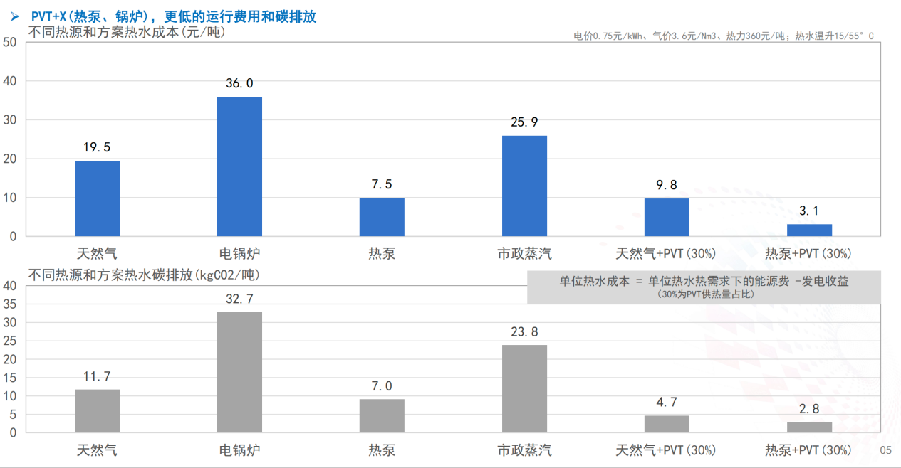而在不同热源和方案热水成本的对比中,按照电价0.75元/kWh、气价3.6元/Nm3、热力360元/吨;热水温升15/55°C的条件,热泵+PVT的单位热水成本仅为3.1元/吨。