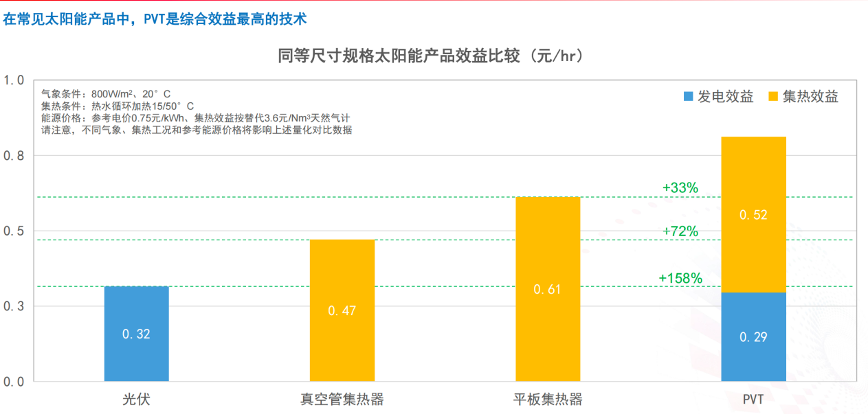 一项测试对比更加明显,同样气象条件、集热条件,以及能源价格情况下,同等尺寸规格太阳能产品效益中,PVT的发电效益为0.29元/hr,集热效益为0.52元/hr。