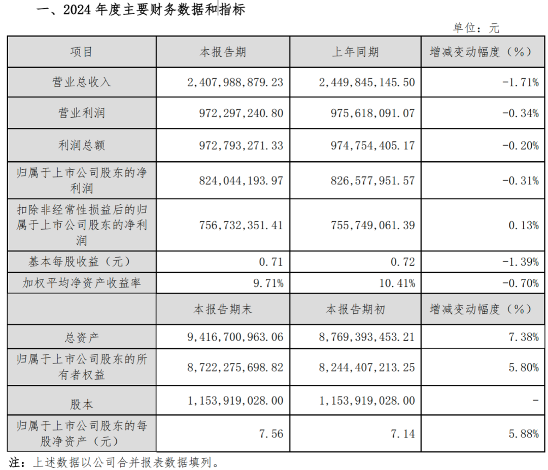 2月26日晚间,涪陵榨菜发布2024年业绩快报。报告显示,2024年,公司实现营收24.08亿元,同比减少1.71%;实现归属净利润8.24亿元,同比减少0.31%;实现扣非净利润7.57亿元,同比微增0.13%。