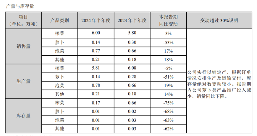 据财报,2024年上半年,榨菜销量为6.00万吨,同比微增3%;萝卜类产品则仅有0.14万吨,同比大幅下跌53%;泡菜销量为0.77万吨,同比增长了17%。