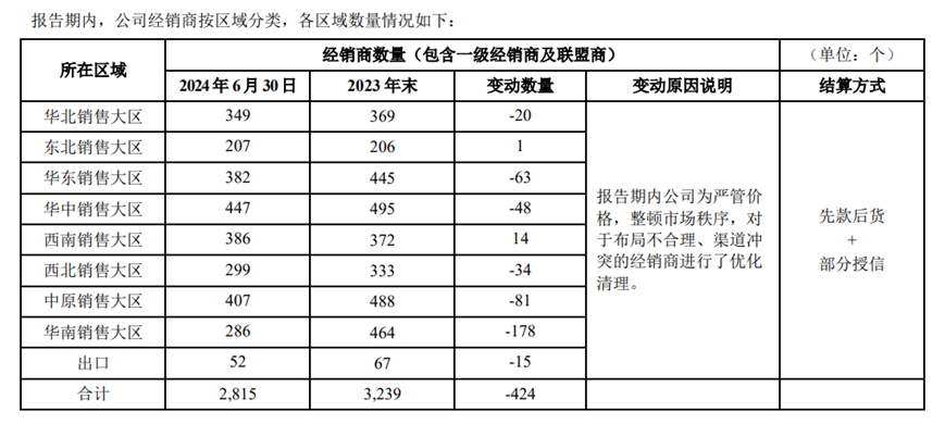 在业绩下滑的背后,是涪陵榨菜经销商规模缩减。截至2024年6月末,经销商数量为2815家,相较于年初的3239家减少了424家。其中,华南销售大区的经销商数量下跌最为严重,从年初的464家减少至286家,减少了178家。公司解释是为了严管价格、整顿市场秩序,对布局不合理、渠道冲突的经销商进行优化清理。