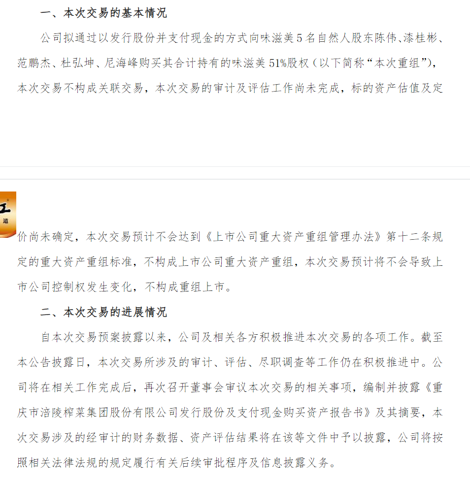 近日,涪陵榨菜再次发公告披露并购进展。根据公告,涪陵榨菜拟通过发行股份及支付现金购买四川味滋美食品科技有限公司(以下简称“味滋美”)51%股权。目前交易的审计及评估工作尚未完成,标的资产估值及定价尚未确定。