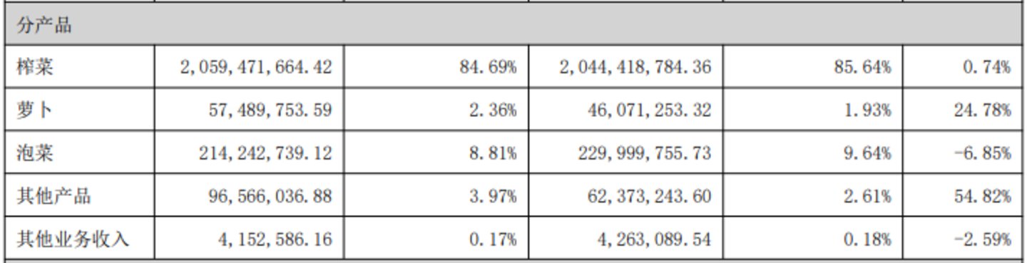 萝卜业务表现亮眼,收入5749万元,同比增长24.78%,成为为数不多的增长亮点;泡菜业务则拖了后腿,收入2.14亿元,同比下滑6.85%;新兴品类“其他产品”收入9657万元,同比大增54.82%,但占比不足4%,对整体拉动有限。