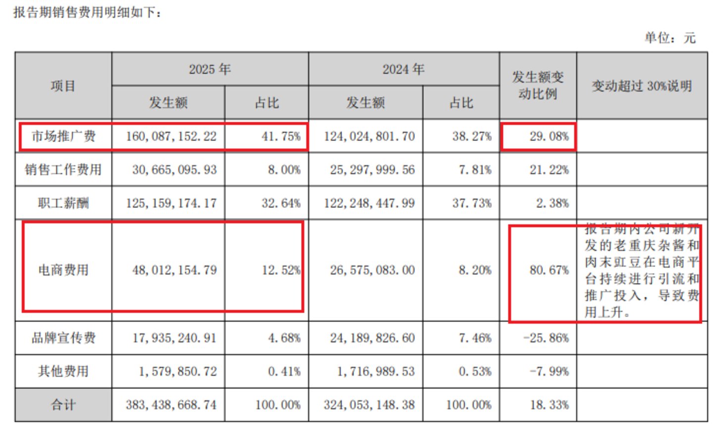 2025年,公司销售费用同比大增18.33%,达到3.83亿元。其中,电商费用激增80.67%至4801万元,主要用于“老重庆杂酱”“肉末豇豆”等新品在抖音等平台的引流推广;市场推广费同比增长29.08%至1.60亿元,占销售费用的41.75%。公司解释称,这是为了“稳固榨菜存量市场、拓展新兴渠道、助推新品上市”而加大投入。