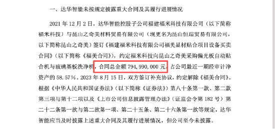根据福建证监局披露的调查结果,达华智能最核心的问题集中在一份未披露的重大合同。2021年12月,公司控股子公司福建福米科技有限公司与昆山之奇美材料贸易有限公司签署设备买卖合同,涉及偏光板自动贴合机与玻璃基板洗净机采购,合同总金额7.9499亿元,占公司最近一期经审计净资产的58.57%。该合同在2023年8月通过补充协议解除,但无论合同签署还是解除,公司均未及时披露相关信息。