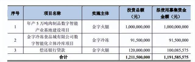 2021年8月,金字火腿发布的2021年度非公开发行A股股票预案显示,公司拟发行2.93亿股,发行价格4.06元/股,拟募集资金规模为11.92亿元,用于年产5万吨肉制品数字智能产业基地建设项目、金字冷冻食品城有限公司数字智能化立体冷库项目、偿还银行贷款。