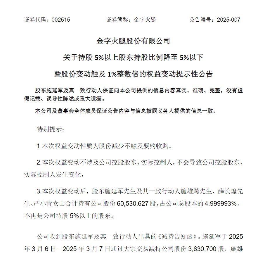 3月11日,金字火腿发布公告披露,该公司的创始人施延军于2025年3月6日—2025年3月7日通过大宗交易减持公司股份3,630,700股,施雄飚于2024年3月19日通过大宗交易减持公司股份10,378,400股,合计减持公司股份14,009,100股,占公司总股本的1.16%。此次减持后,施延军及其一致行动人持股比例从6.16%降至5%以下,股份变动触及1%的整数倍。