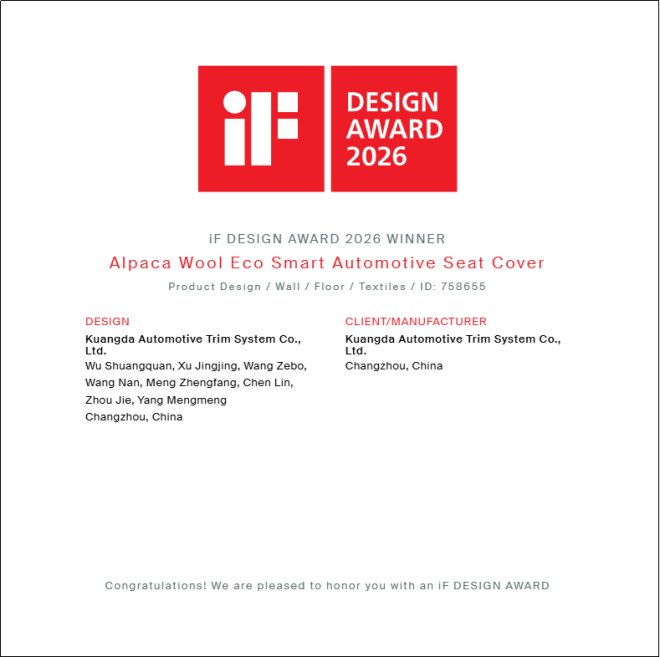 近日,2026年度德国iF设计奖获奖名单揭晓,旷达科技凭借卓越的设计创新与产品实力,旗下“K·DEF SHIELD高性能面料”与“羊驼绒绿色智能汽车座套”两款产品,从全球万余件参赛作品中脱颖而出,成功摘得此项国际权威殊荣。这是企业继2025年后再度斩获此奖,用实力诠释中国企业的设计匠心与创新底气。