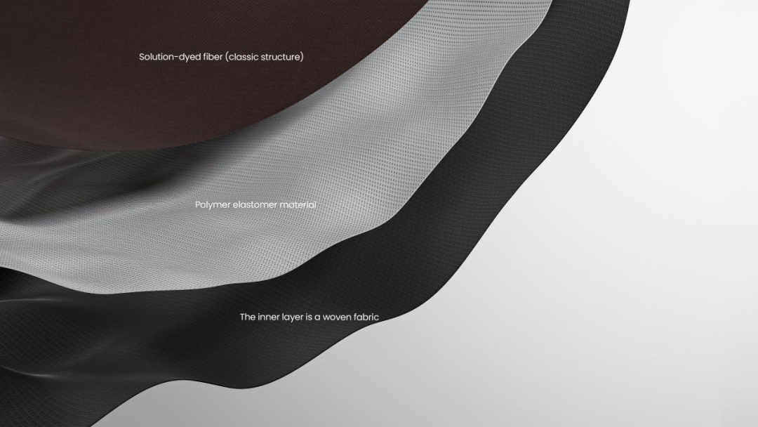“K·DEF SHIELD高性能面料”采用独特三层复合结构设计,表层原液着色纤维兼具美学与耐候耐磨性能,中间层聚合物弹性体材料赋予防水与柔韧弹性功能,内层为可定制化的织物面料满足个性化设计需求,广泛适配汽车内饰及高端交通工具应用场景。