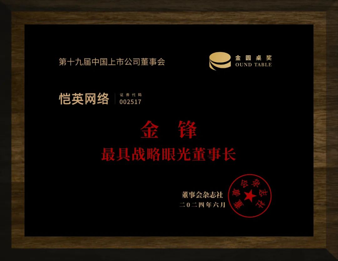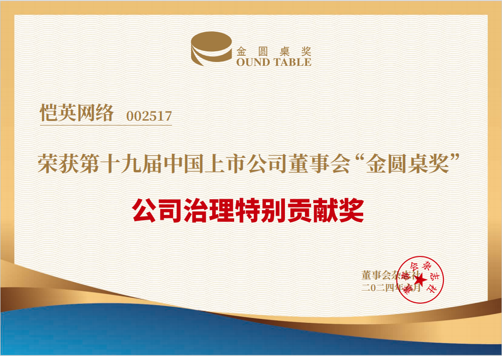 恺英网络荣获“金圆桌奖”——公司治理特别贡献奖。恺英网络董事长金锋先生荣获第十九届中国上市公司董事会“金圆桌奖”——最具战略眼光董事长奖。恺英网络董事、副总经理骞军法先生代表公司出席活动。