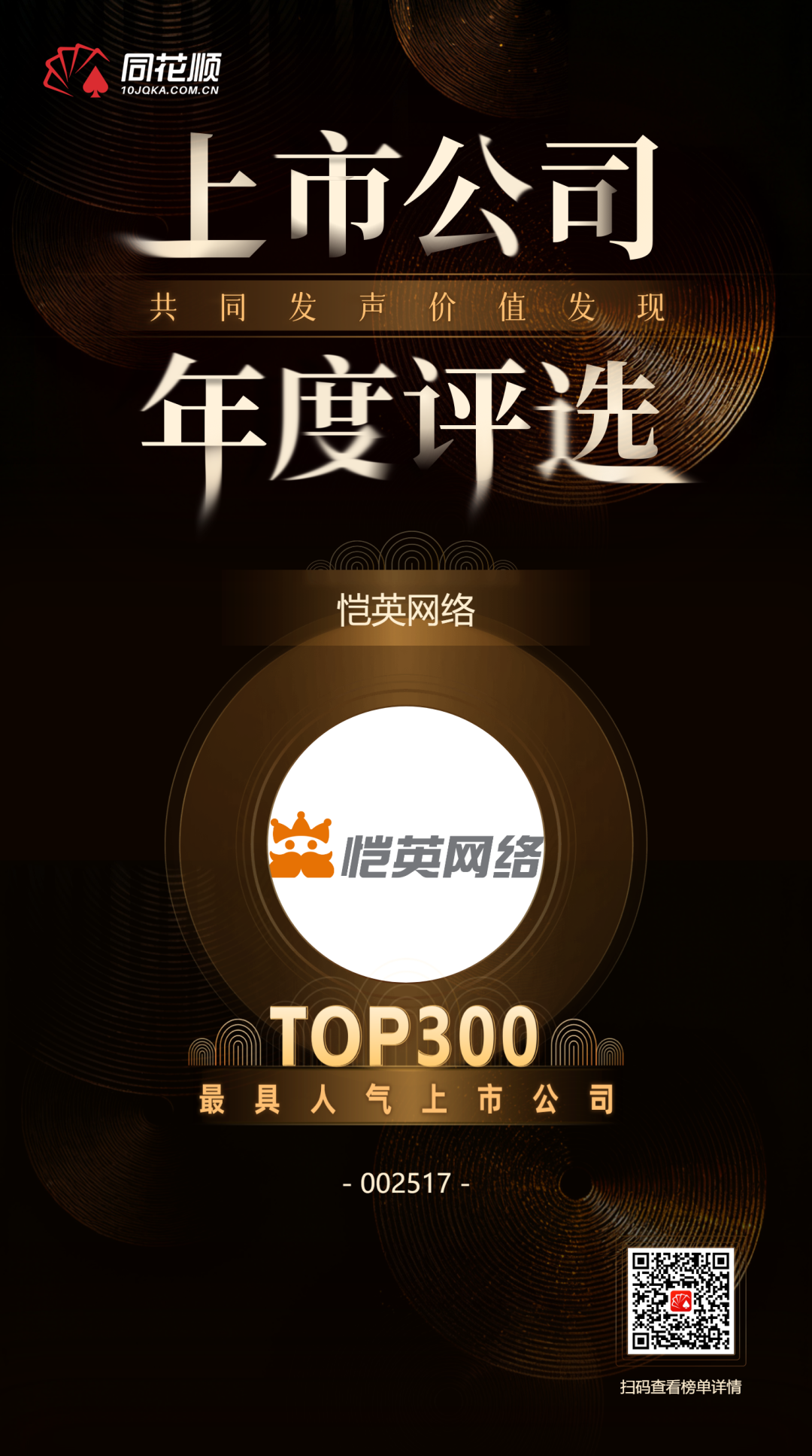 1月15日,“共同发声?价值发现——资本市场高质量创新发展交流会暨同花顺2025年度评选颁奖典礼”在杭州举行,恺英网络凭借凭借卓越的专业能力、突出的创新实践与超高的市场人气,成功摘得“最具人气上市公司TOP300”荣誉,彰显了资本市场对公司综合价值的高度认可。