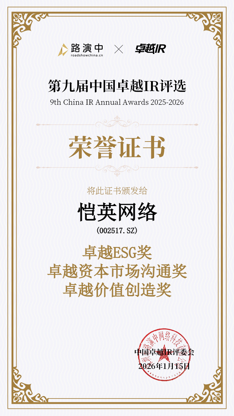 1月15日至16日,“聚变·2026上市公司投资者关系创新峰会暨第九届中国卓越IR颁奖盛典”在深圳举行。恺英网络凭借在资本市场沟通、企业价值创造及ESG领域的卓越表现,摘得“卓越资本市场沟通奖”“卓越价值创造奖”“卓越ESG奖”三大奖项。