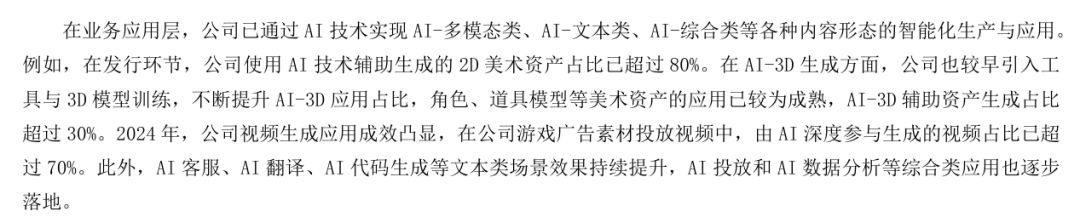 行业龙头三七互娱(002555.SZ)自主研发了游戏领域行业大模型“小七”,并以此为核心构建了超过40种AI能力。三七互娱在2024年报中披露,发行环节使用AI技术辅助生成的2D美术资产占比已超过80%。