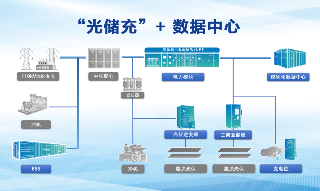 集装箱大储可为数据中心建筑乃至园区提供移谷补峰和峰谷套利;光伏+工商业储能,可为园区充电桩、消防、应急照明等设施供电,提升绿电自发自用的比例,如有余电还可与科士达电力模块实现联合供电,助力扛峰。