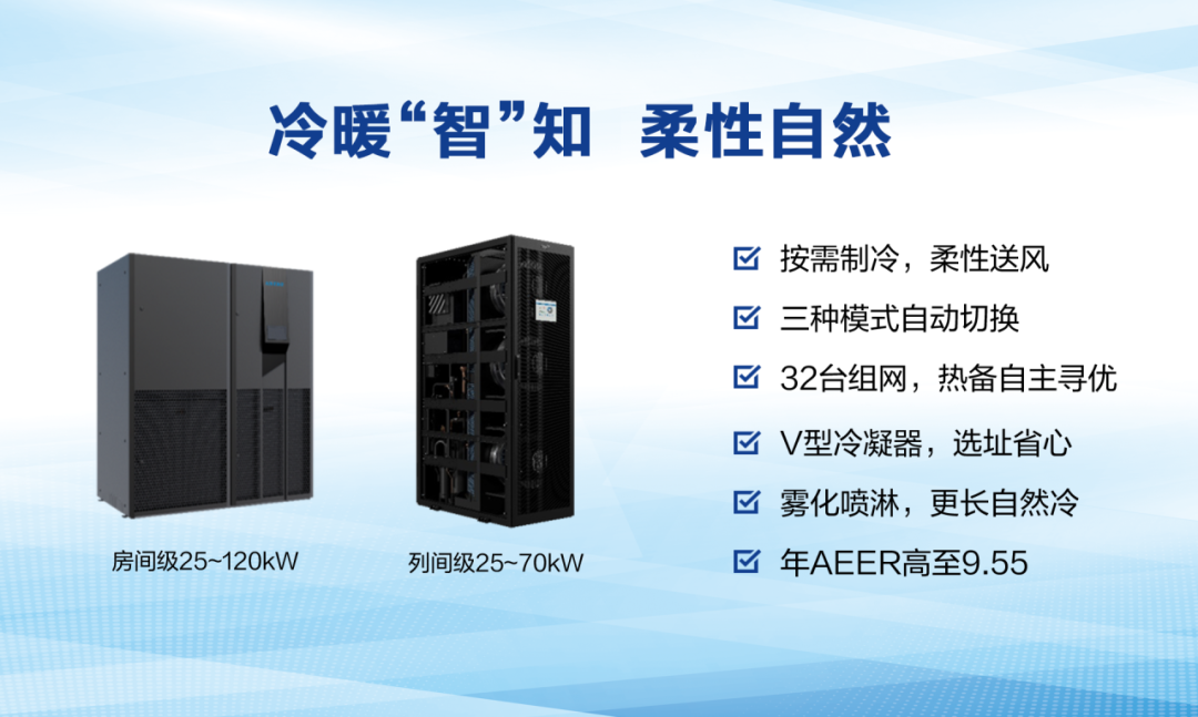 科士达房间级25~120kW及列间级25~70kW全变频氟泵间接蒸发冷精密空调:将充分利用自然冷源、柔性机械制冷、WUE≈0这些特性无缝整合,CLF低至0.11。凭借集中式冷凝器,又能很大程度上解决传统风冷室外机选址难的问题。科士达AI热管理系统通过精准预测热负荷数值,针对性的对空调群组下发实时调度指令,在确保温场稳定的前提下,实现空调群组整体能效的动态调优。