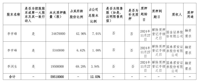 其中,李学峰质押4001万股,占其所持股份比例为49.58%;李润生质押1950万股,占其所持股份比例为69.28%。