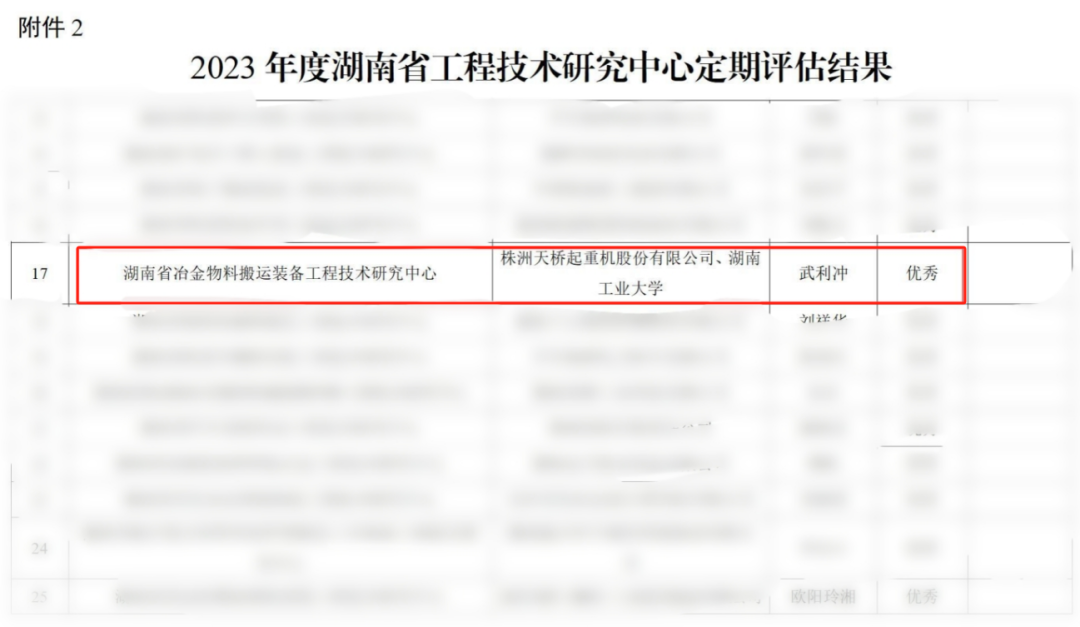 近日,湖南省科学技术厅公示了2023年度湖南省重点实验室和省工程技术研究中心验收结果名单。全省128家工程技术研究中心经单位自评、专家会议评估、现场抽查、专题会议研究等程序,共25家工程中心获评“优秀”,其中天桥起重“湖南省冶金物料搬运装备工程技术研究中心”荣获“优秀”等级。