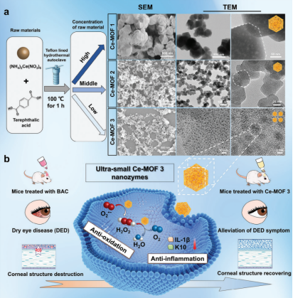 2024年2月,复旦大学附属眼耳鼻喉科医院黄锦海/周行涛教授团队与上海理工大学李贵生教授团队携手合作,在国际材料学顶尖学术期刊《Advanced Functional Materials》(中科院Top一区,IF =19.0)上发表封面论文《Engineering Ultra-Small Cerium-Based Metal–Organic Frameworks Nanozymes for Efficient Antioxidative Treatment of Dry Eye Disease》。黄锦海/周行涛团队从临床问题出发,率先研发出一种超小型(2-3nm)的铈基金属有机框架(Ce-MOFs)纳米酶,实现了无创且高效的干眼治疗,为干眼治疗打开新路径。