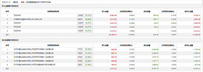 具体来看,机构买入1.72亿元,卖出436.58万元,合计净买入1.68亿元。此外,中国国际金融上海分公司、东方财富证券拉萨团结路第二证券营业部分别买入5214.03万元、826.18万元;东方财富证券拉萨东环路第二证券营业部、东方财富证券拉萨团结路第二证券营业部分别卖出2328.68万元、2086.22万元。