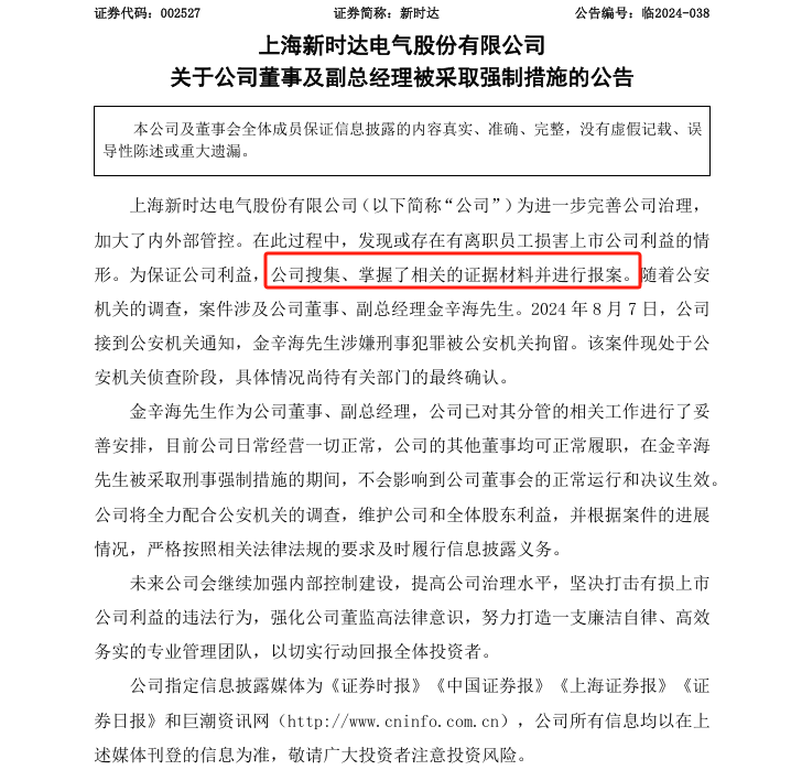上述董事刚辞职不久,在新时达工作多年的另一高管——董事及副总经理金辛海,因涉嫌职务侵占罪,被有关部门批准逮捕。从彼时披露的公告来看,金辛海职务侵占一事败露,或为内部检举、揭发的结果。这让外界对新时达内部的“较量”,产生了广泛猜想。