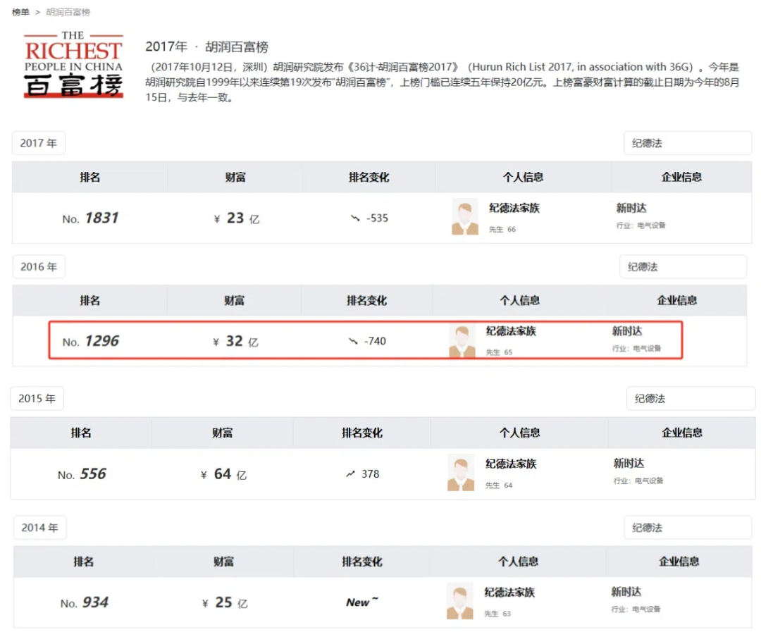 源媒汇梳理发现,2014年至2017年,纪德法家族连续4年登上胡润百富榜。其中,在纪德法辞任新时达董事长的前一年达到顶峰——2015年,纪德法家族财富达到64亿元,位列胡润百富榜556位。