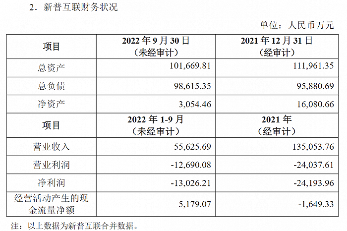 2022年1-9月,新普互联净利润继续亏损1.30亿元,占到当期英飞拓亏损的一半。