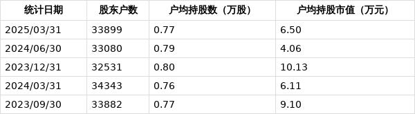 从4月28日公开信息显示,海源复材截至2025年3月31日公司股东户数为3.39万户,较上期(2024年6月30日)减少696户,降幅为2.01%,变化不大。
