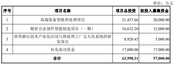金财互联(002530.SZ)昨晚披露的关于2026年度向特定对象发行A股股票预案显示,本次向特定对象发行A股股票募集资金总额不超过57,000.00万元(含本数),扣除发行费用后,募集资金拟投资于以下项目:高端装备智能热处理项目、精密合金部件智能制造项目(一期)、热等静压技术产业化应用与热处理工厂无人化系统的研发项目和补充流动资金。
