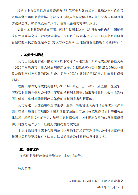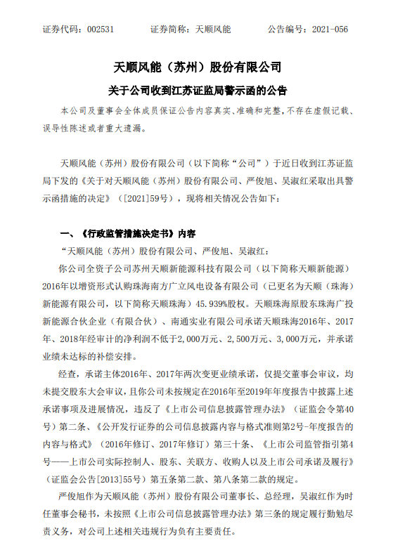 近日,天顺风能因增资形式认购珠海南方广立风电设备有限公司相关事宜遭到江苏证监会警示。严俊旭作为天顺风能(苏州)股份有限公司董事长、总经理,吴淑红作为时任董事会秘书,未按照《上市公司信息披露管理办法》第三条的规定履行勤勉尽责义务,对公司上述相关违规行为负有主要责任。以下为具体公告: