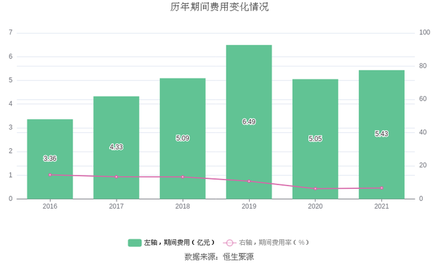 2021年全年,公司期间费用为5.43亿元,较上年增加3867.83万元;期间费用率为6.65%,较上年上升0.42个百分点。