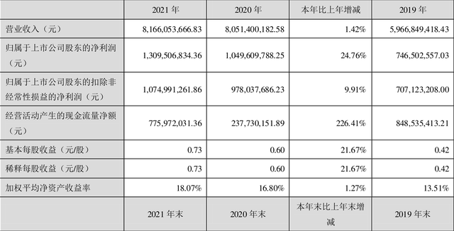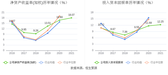 数据显示,2021年公司加权平均净资产收益率为18.07%,较上年同期增长1.27个百分点,已经连续三年维持增长;公司2021年投入资本回报率为12.25%,较上年同期增长0.57个百分点。