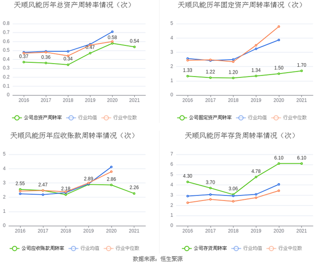 营运能力方面,2021年,公司总资产周转率为0.54次,上年同期为0.58次(2020年行业平均值为0.71次,公司位居同行业9/15);固定资产周转率为1.70次,上年同期为1.50次(2020年行业平均值为3.86次,公司位居同行业12/15);公司应收账款周转率、存货周转率分别2.26次、6.10次。