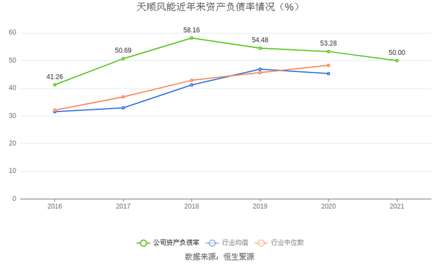 在偿债能力方面,公司2021年末资产负债率为50.00%,相比上年同期下降3.28个百分点,近年来整体高于行业均值。