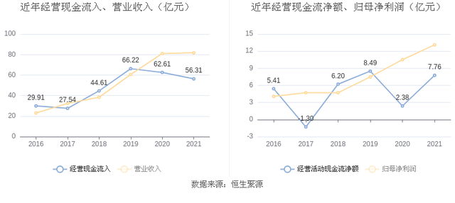 2021年,公司营业收入现金比为68.91%,净现比为59.26%。从近年数据来看,公司经营活动现金流入的增速整体不及营业收入增速。