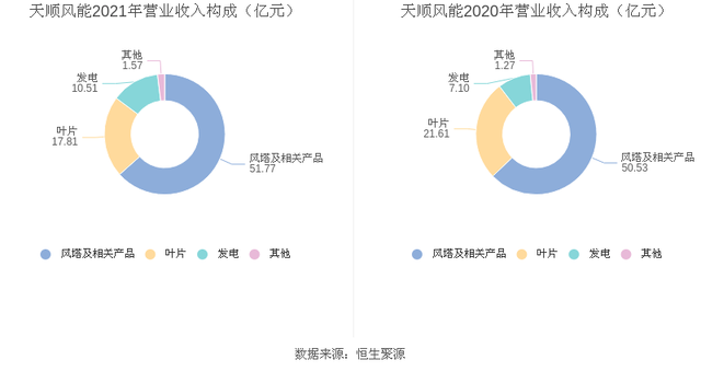 2021年度公司主营业务中,风塔及相关产品收入51.77亿元,占营业收入的63.40%,同比增长2.47%;叶片收入17.81亿元,占营业收入的21.81%,同比下降17.58%;发电收入10.51亿元,占营业收入的12.86%,同比增长47.94%。