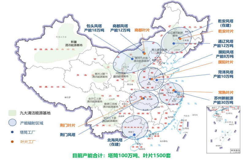 在陆上风电塔架方面,2023年预计将在吉林乾安、广西北海建设新生产基地。在叶片及模具方面,将继续完善全国范围生产布局,在东北等区域继续选点设厂,并与塔筒业务相互协同配合。