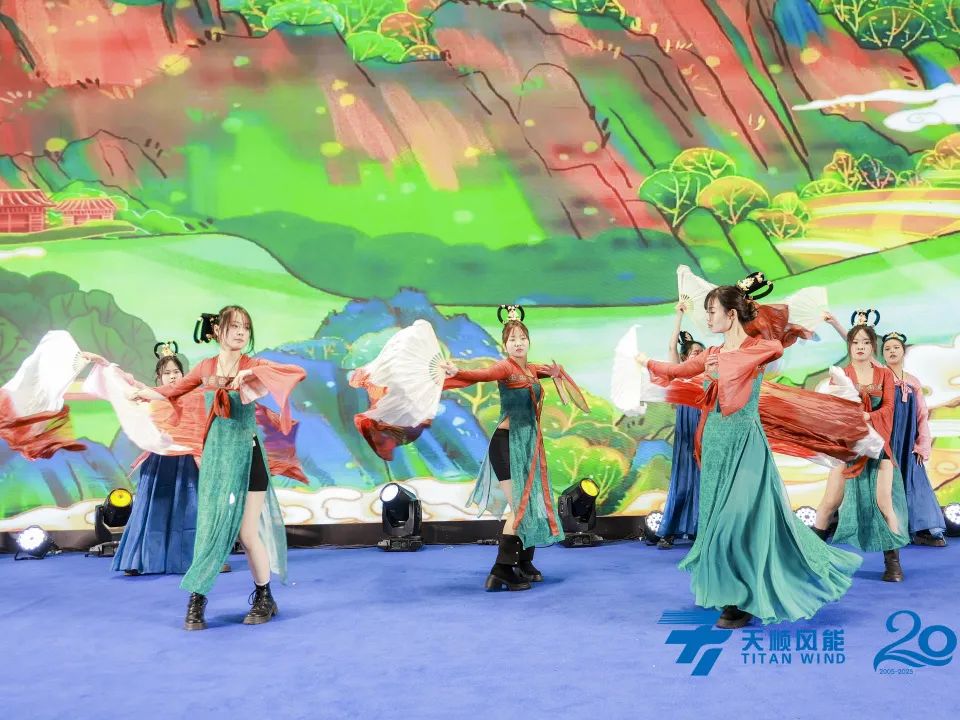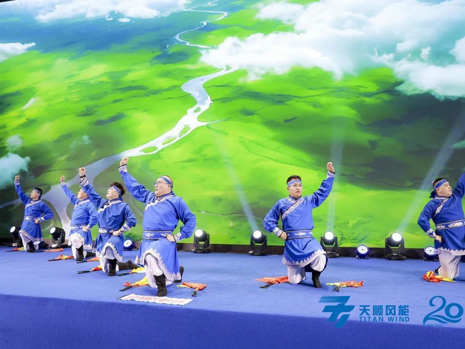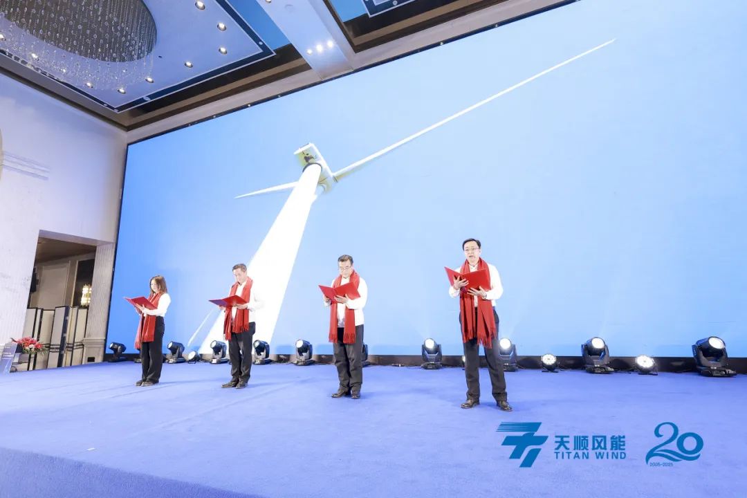晚会的压轴节目由高管团队代表带来的原创诗朗诵《风颂》。整部作品宛如一部生动的史诗,细致入微地刻画了天顺风能二十年来的奋斗征程与辉煌成就,每一个字句都仿佛敲打着观众的心弦,赢得现场掌声雷动,久久不息。